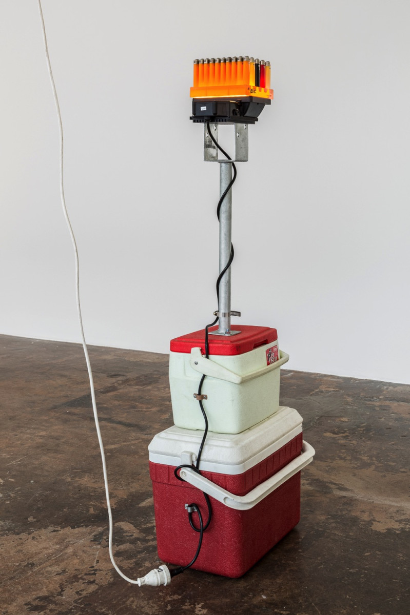 Each of the pieces (containers) in the exhibition use a certain tool as plinth, such as scales and hand trolleys, referencing devices that aid in the movement or comprehension of objects. These items demonstrate their own ‘readiness’ to be transported, inherently mobile by design.