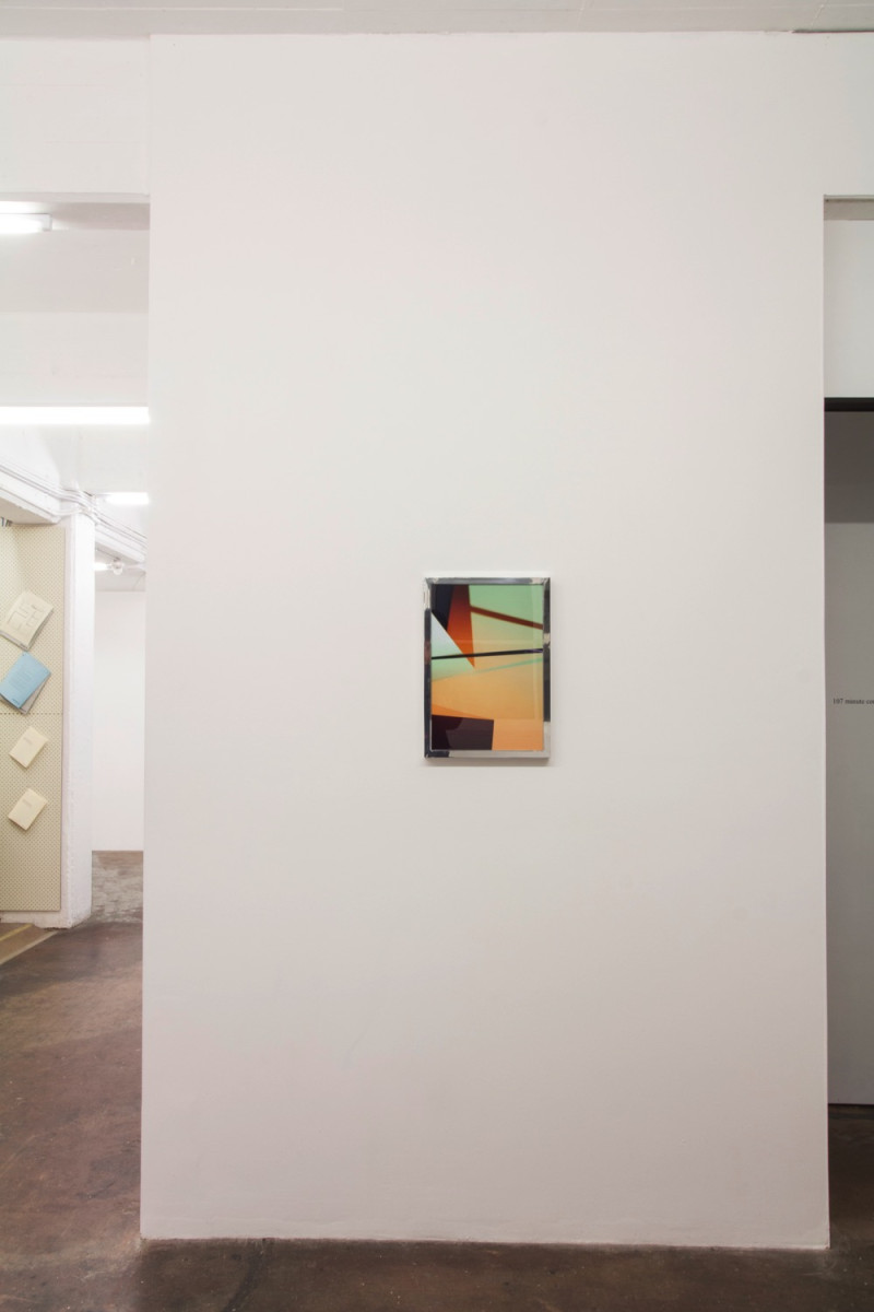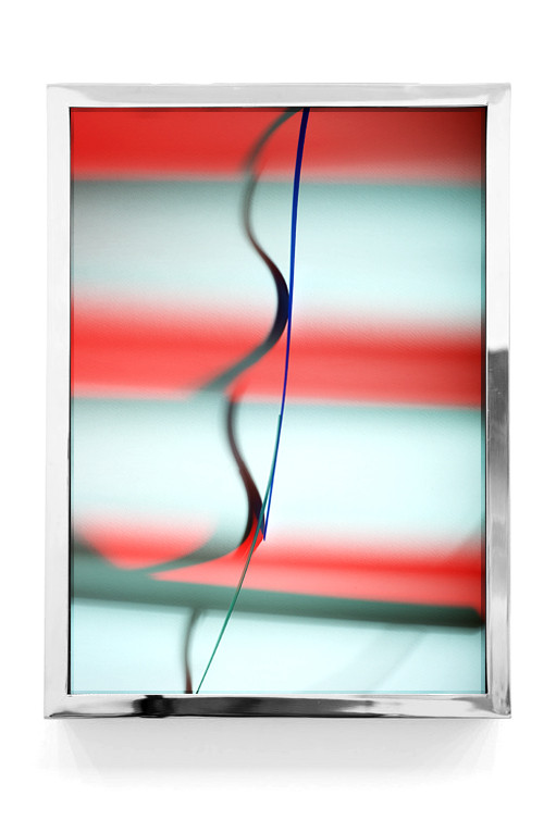 These works are extended in aluminum frames. The highly polished and smooth surfaces complement the precise angles and the unfolding illusion of the image itself.