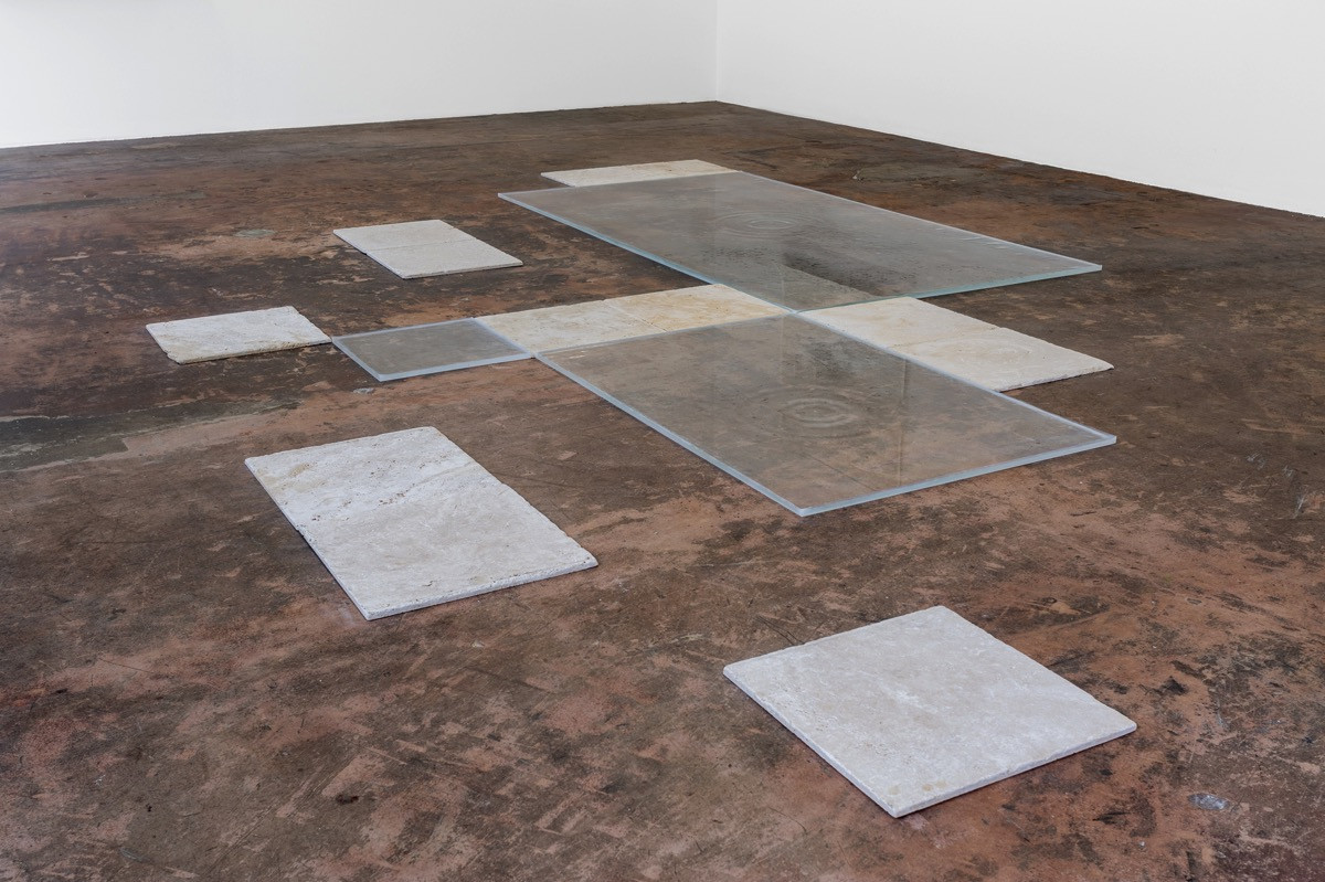 Griffith’s ‘Fountains’ focus on the geological formation of Travertine, a terrestrial sedimentary rock formed by the precipitation of carbonate minerals in ground and surface waters. Through this material investigation, Griffiths re-articulates the historic fountain as an ecosystem where cycles of growth and decay constantly transform these monuments to our most precious natural resource. Griffiths’ elemental reduction of the fountain, to an almost invisible basin and a few roof leaks within the gallery, alongside the travertine tiles, dispersed around the water catchments mark both momentary and deep time.