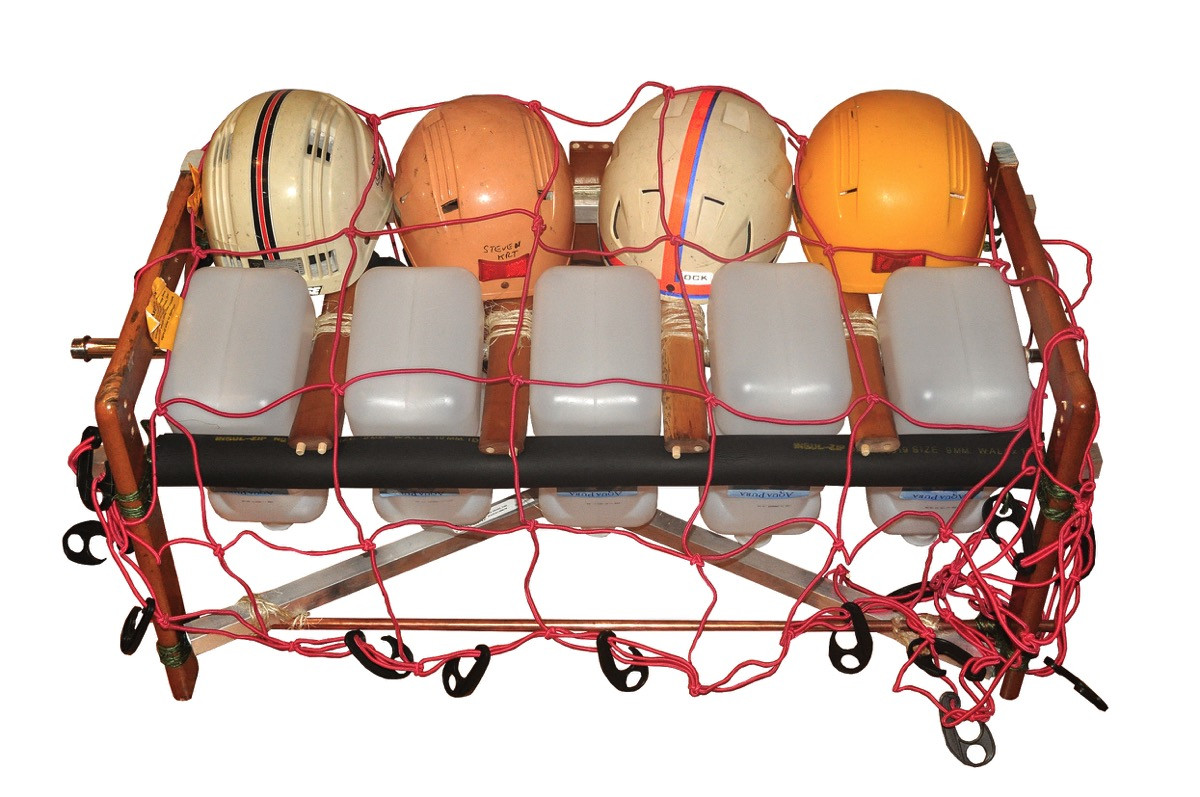 Alesis trigger, aluminium, bucket, chair, copper, dowel, Edirol MA20s, foam, helmets, mat, MSI Wind U200, mover’s carpet, net, piezos, RCA to 3.5mm cable, rope, tape, USB cables, water bottles.